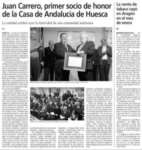 La decisión se formalizó con la entrega de un diploma acreditativo, tras el saludo del actual presidente, Nicasio Raya, las palabras de la vicepresidenta, Amalia Foncillas, y la lectura de un poema a cargo de Toño Julve. Tras la entrega, los asistentes disfrutaron del baile de sevillanas, a cargo de Susana Raya, y la interpretación del Himno de Andalucía, en la voz de María Antonia Díaz. El acto finalizó con un vino aragonés y andaluz al son de sevillanas.